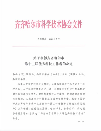 齐齐哈尔市优秀科技工作者评选工作每两年一届,至此已举办十三届。经基层推荐、专家评审、社会公示,全市共有88名同志被评为“齐齐哈尔市优秀科技工作者”。