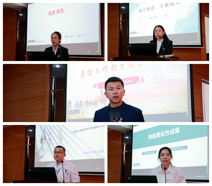 思政教学部赵铭以《将结果化为成果》为题、健康与护理系姜佳以《“偶然”中的“必然”》为题、建筑工程系王雪《勇于挑战,才能成长》为题、学校办公室隽永刚以《高效工作始于流程再造》为题、基础部徐怡《蜕变•重生》为题,分别代表所在部门分享了精彩的案例故事,畅谈成长与收获、经验与教训,进而总结与反思工作。