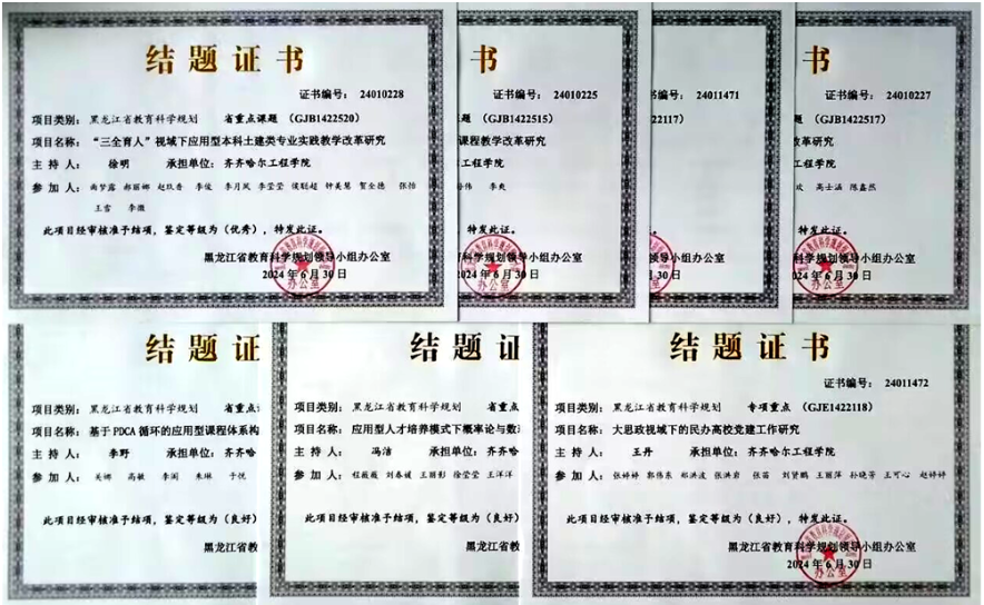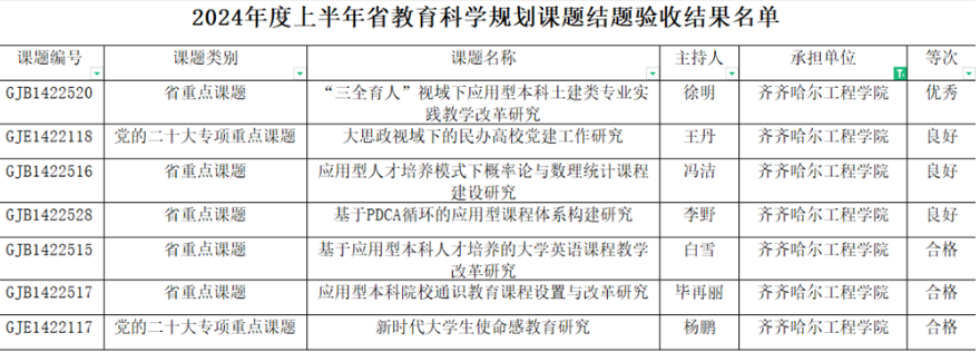 近日,黑龙江省教育科学规划领导小组办公室下发通知公布上半年课题结题验收结果,学校教工主持的7项省教育科学规划重点课题顺利通过结题验收,结题通过率100%。其中,徐明老师主持的课题获得优秀,王丹、冯洁、李野三位老师的课题获得良好,此次课题结题优良率达57%。